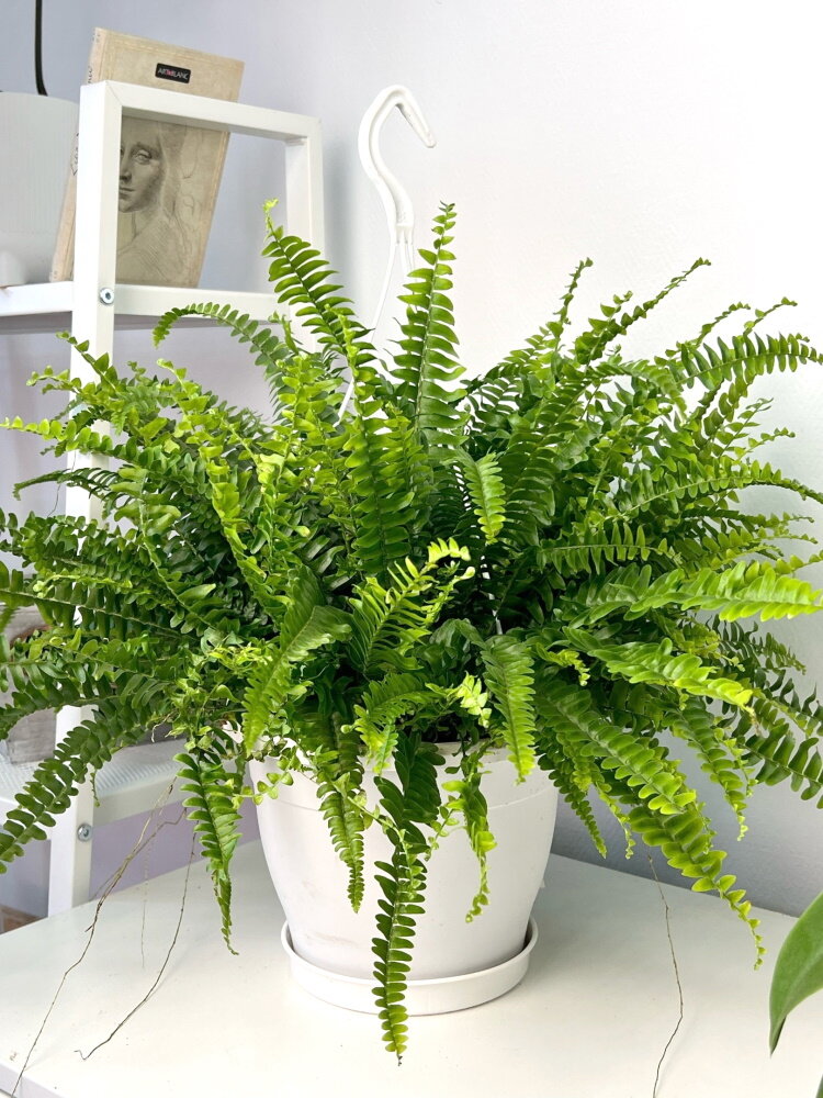 Com folhas arqueadas e textura delicada, a samambaia americana traz frescor e um aspecto vintage aos ambientes úmidos, como cozinhas e banheiros.